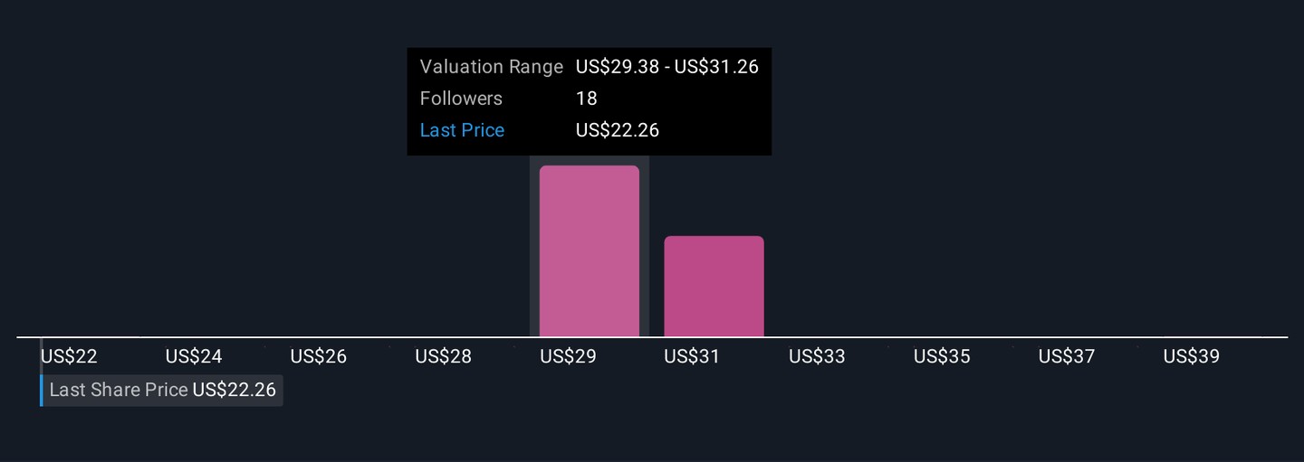 For example, some investors currently see Weyerhaeuser’s fair value as high as $38 if they believe in aggressive margin expansion and climate solutions growth. More cautious views set it closer to $29 due to softer lumber demand or international challenges. With Narratives, you are empowered to follow the scenario that matches your own logic and adjust as new events unfold.