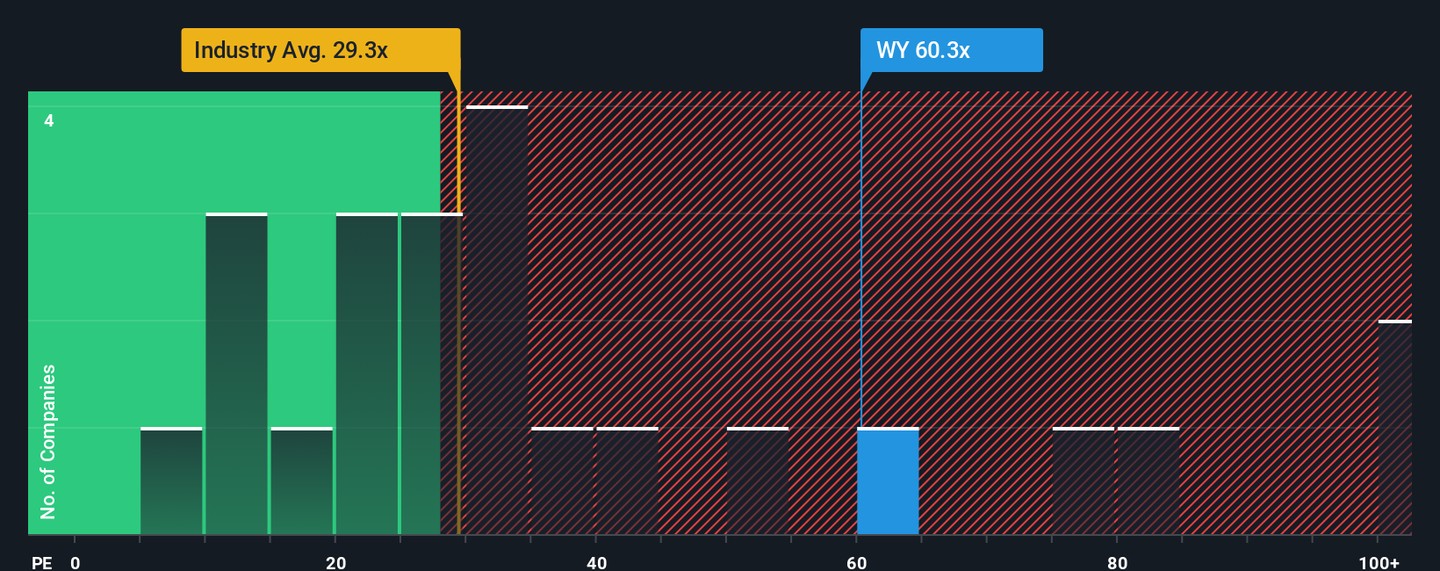 Weyerhaeuser currently trades at a PE ratio of 48.5x. This stands in sharp contrast to the industry average of 17.0x and the peer group average of 28.0x. At first glance, this might suggest that the stock is expensive. However, headline comparisons like these can be misleading since they ignore company-specific fundamentals.
