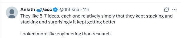 Other users commented that they liked 5-7 ideas, each relatively simple, stacked continuously, resulting in unexpectedly better outcomes, looking more like engineering than research.