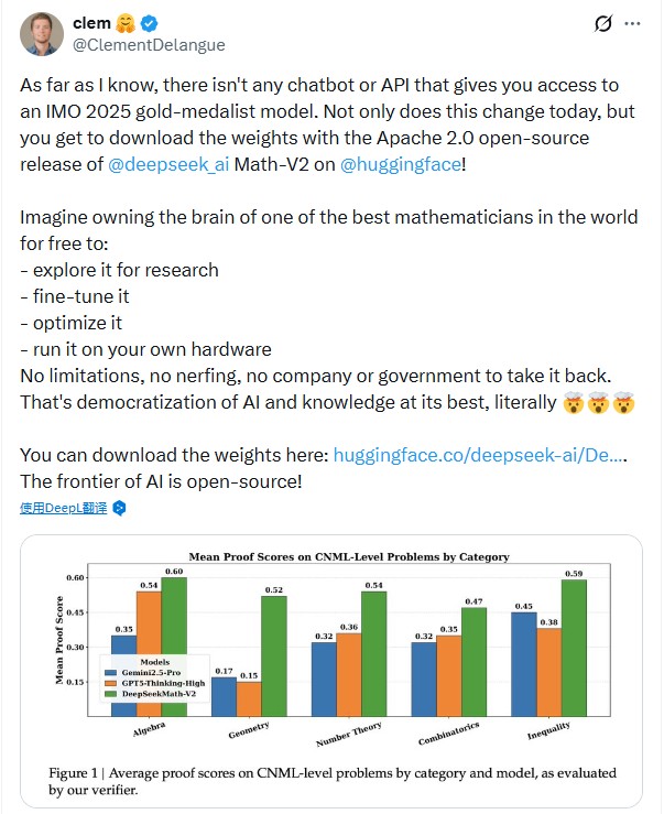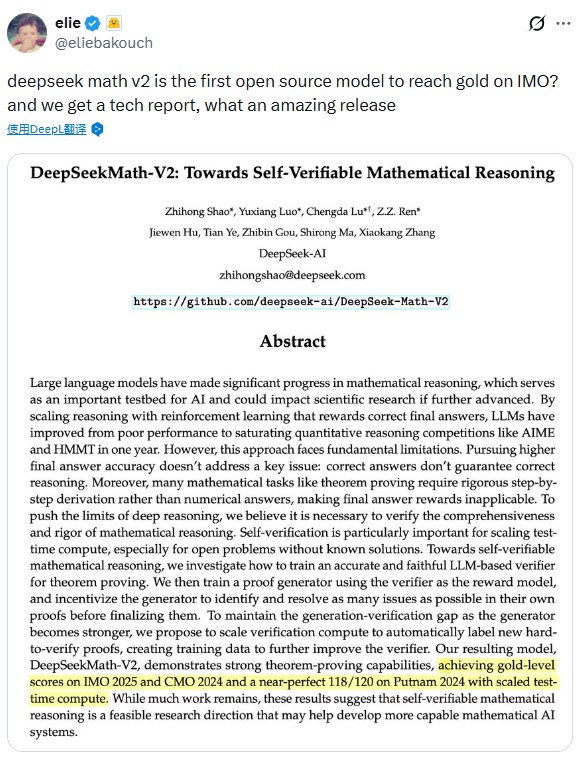 Another user, elie, also commented: "Is DeepSeek Math V2 the first open-source model to achieve gold medal level at the IMO? And we also got a technical report; this is truly a remarkable release."