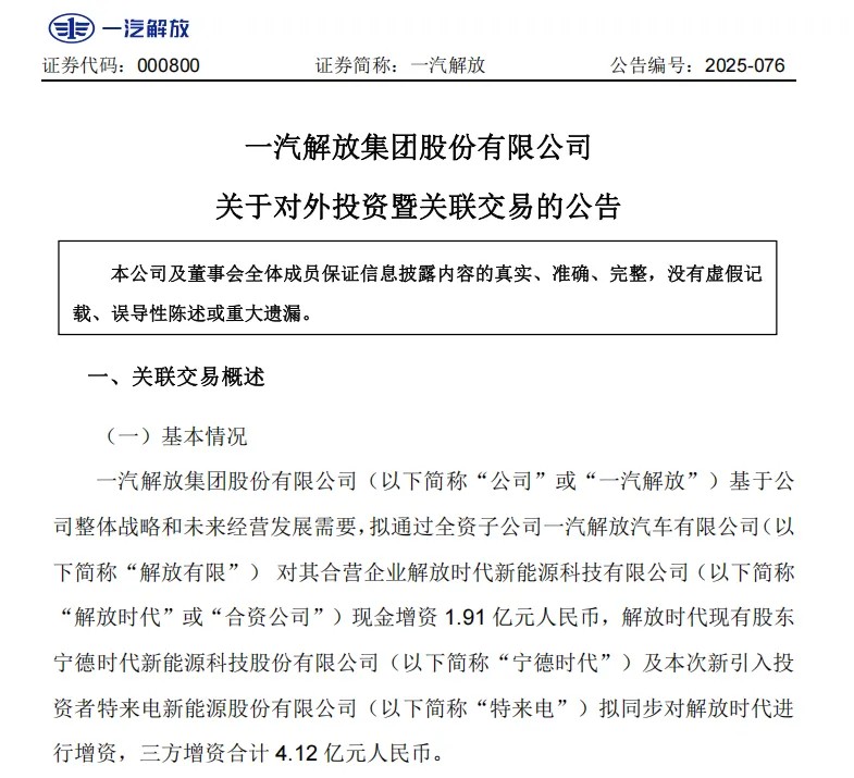 On the evening of November 27, FAW Jiefang announced that it would increase its investment in the joint venture, Jiefang Times New Energy Technology Co., Ltd., by 191 million yuan through its wholly-owned subsidiary. CATL and the newly introduced investor, Teladoc New Energy Co., Ltd., will also increase their investments simultaneously, with a total increase of 412 million yuan from the three parties.