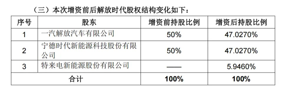 After the transaction is completed, Jiefang Times' registered capital will be significantly increased from 90 million yuan to approximately 491 million yuan. In terms of equity structure, FAW Jiefang and CATL's shareholding ratios will be adjusted to 47.0270%, while the charging facility leader Teladoc will hold 5.9460% of the shares.
