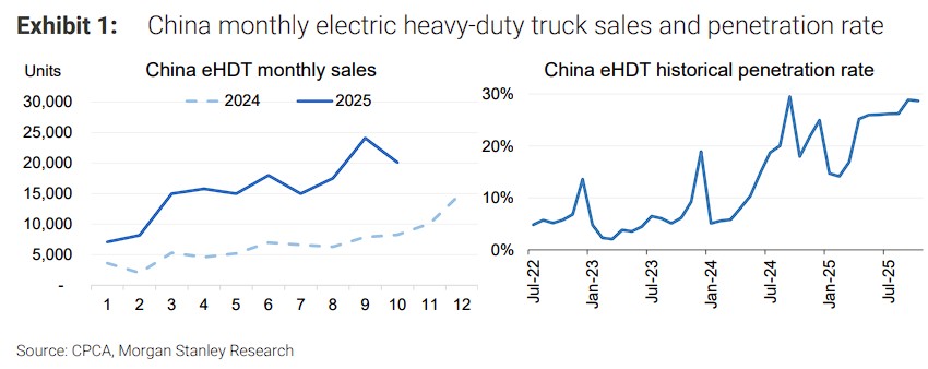 Morgan Stanley data shows that in October 2025, the sales of electric heavy-duty trucks in China increased by 144% year-on-year, with a penetration rate reaching approximately 29% that month, meaning that for every three heavy-duty trucks sold, one is electric. The firm predicts that the penetration rate of electric heavy-duty trucks will further increase to 35% in 2026.