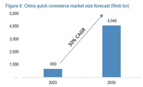According to JP Morgan, the quick commerce market is expected to grow 30% on average in the coming five years, reaching around 4 trillion RMB, including food delivery. This hyper-fast growth will come from both cannibalising the traditional e-commerce product lines (more customers will opt for quicker delivery) and also from newly created demand.