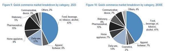 Quick Commerce emerged on the back of traditional e-commerce. Quick commerce is the delivery of food and non-food items within a very short period of time, often within 30-60 minutes, which is much faster than what conventional e-commerce used to offer (a couple of days). It primarily includes perishable items like food (meat and groceries), beverages (bubble tea, coffee), tobacco, alcohol, but also daily necessities, pharmaceuticals, home appliances and even clothes and electronics.