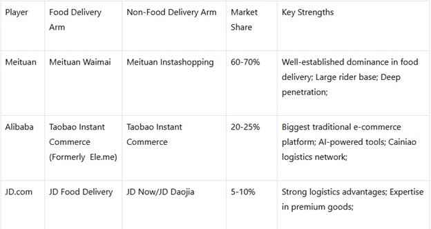 Who’s winning right now? In quick commerce and food delivery, Meituan remains the incumbent leader with a 50–60 % share, followed by Alibaba (formerly Ele.me, now fully integrated into Taobao Instant Commerce) at 25–30 % and JD at a fast-growing but still modest 5–10 %, which recently entered the food delivery market.