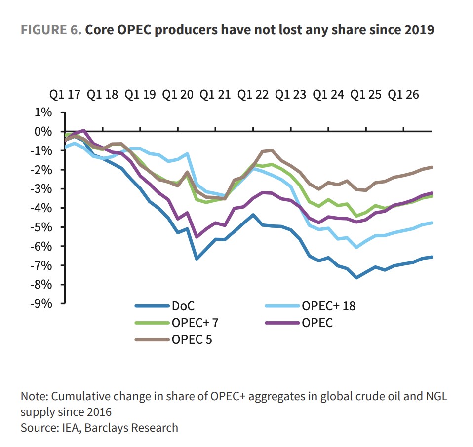 Barclays analyzes that OPEC+'s actual production increase capacity has significantly lagged behind its policy targets. Data shows that since the policy shift in March this year, although the 18 OPEC+ countries have cumulatively raised production targets by 2.6 million barrels per day, actual production has only increased by 1.2 million barrels per day, with an execution rate of less than 50%, reflecting that most member countries face ongoing capacity constraints At the same time, the global oil supply elasticity is systematically declining. With the slowdown in U.S. shale oil growth and the depletion of resources in other non-OPEC regions, global effective idle capacity is increasingly concentrated in a small number of core OPEC oil-producing countries such as Saudi Arabia and the UAE. Data shows that since 2019, the share of core OPEC countries in global crude oil and natural gas liquids production has remained stable, and it is expected to further increase next year, strengthening their pricing power in the global supply landscape.