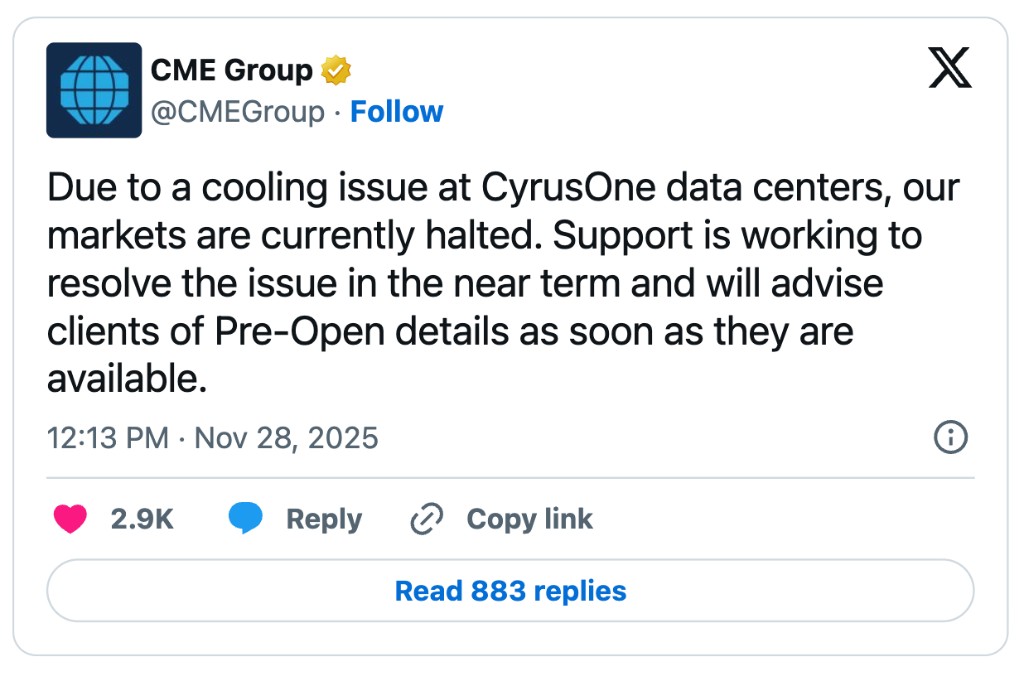 This failure occurred during a shortened trading session after Thanksgiving, coinciding with a critical window for monthly contract rollovers, further amplifying the difficulty of market operations and risk exposure. Analysts stated that this incident once again highlights the systemic vulnerability of global financial infrastructure in the face of a single point of failure.