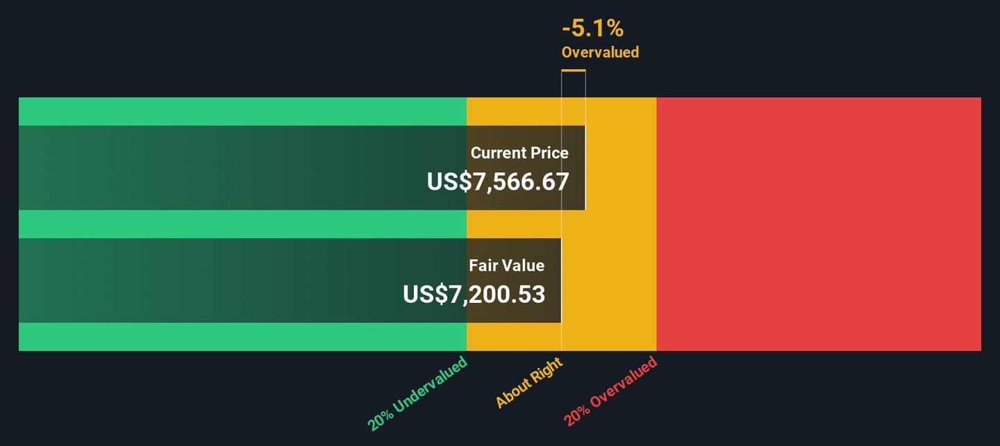 While the price-to-earnings ratio suggests NVR is trading at a premium, our DCF model provides a different perspective. According to this cash flow based approach, NVR is actually trading above its estimated fair value of $7,200.53, implying the shares may be overvalued right now. Could the outlook change if market assumptions shift?