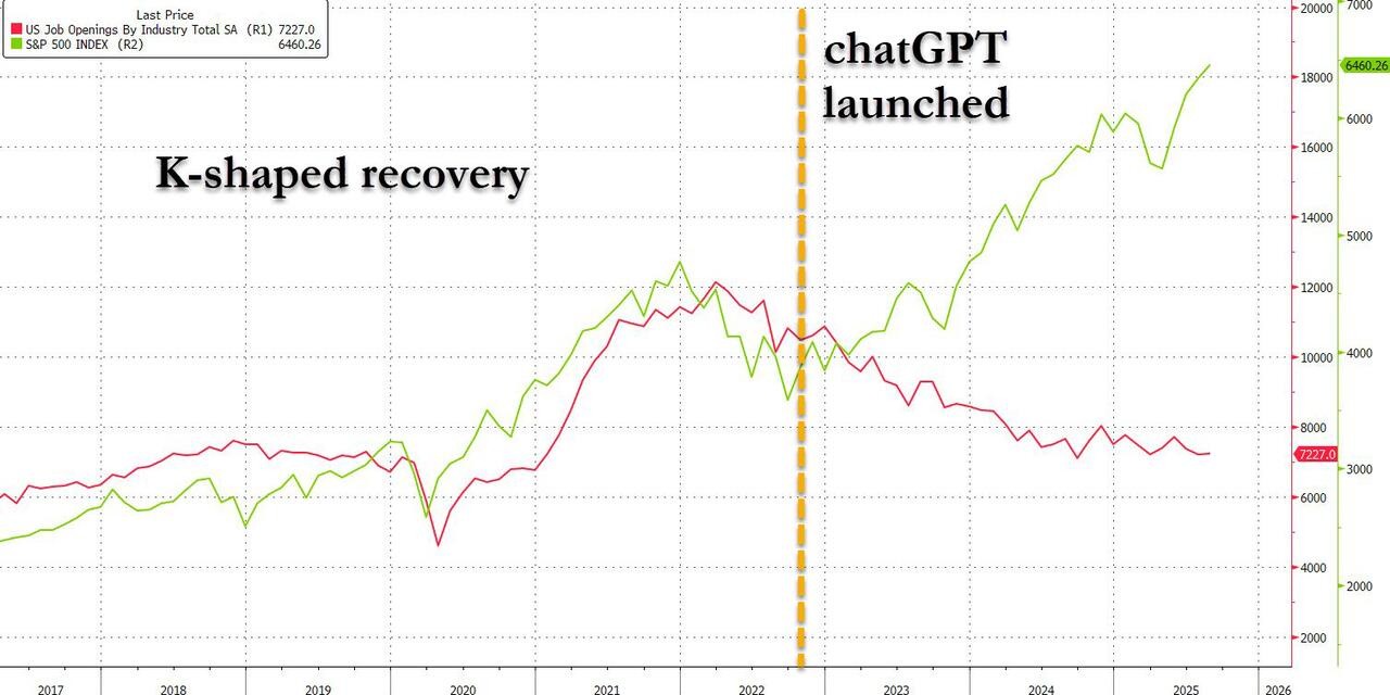 Since the release of ChatGPT, marking the beginning of the AI era, the U.S. stock market has been in a continuous bull market (green line), while the U.S. job market (red line) has been declining