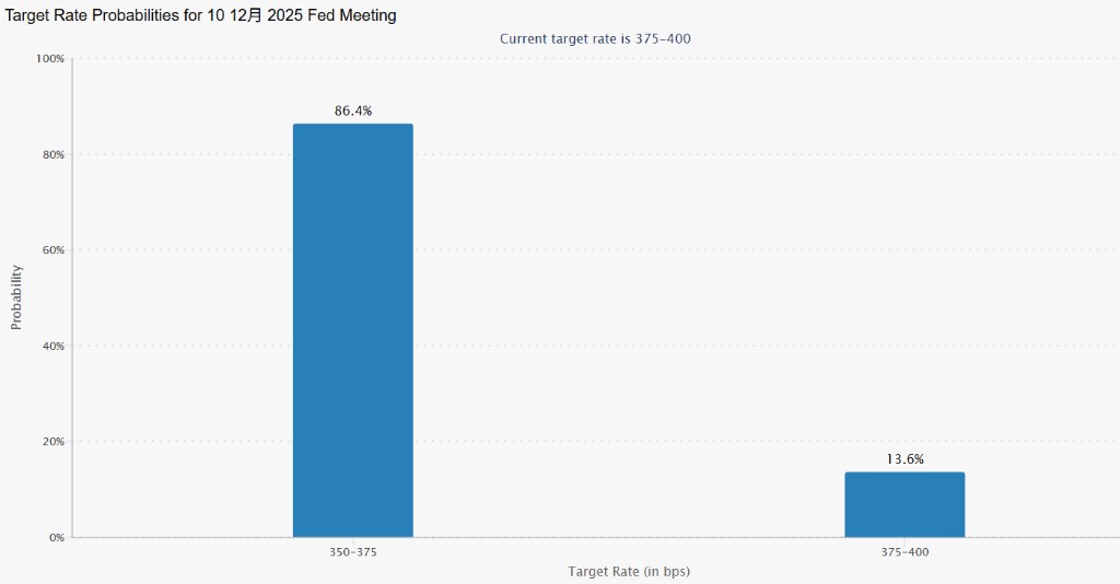 According to data from the CME FedWatch Tool, the market now estimates an 86.4% probability that the Federal Reserve will cut interest rates by 25 basis points at its meeting on December 10, significantly up from 71% a week ago.