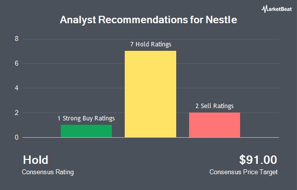 Nestle SA (OTCMKTS:NSRGY - Get Free Report) has been given an average rating of "Hold" by the six brokerages that are covering the stock, Marketbeat.com reports. One equities research analyst has rated the stock with a sell recommendation, three have issued a hold recommendation, one has assigned a buy recommendation and one has issued a strong buy recommendation on the company. The average 1 year target price among brokers that have covered the stock in the last year is $91.00.
