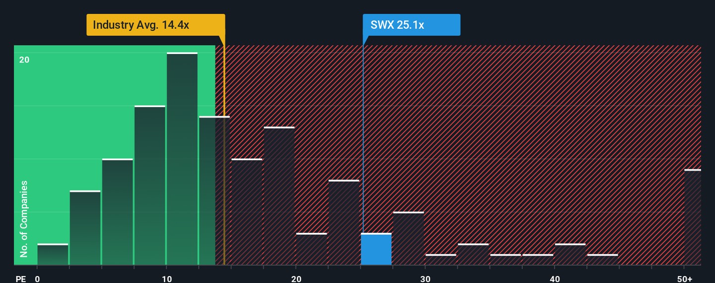 Looking beyond fair value estimates, Southwest Gas Holdings is priced at 25.1 times its recent earnings. This is noticeably higher than both the industry average of 14.3x and peers at 17.2x. Given that the fair ratio is closer to 20.4x, this signals the stock is trading at a notable premium. Could this premium reflect confidence in management or is it a risk if the expected growth does not materialize?