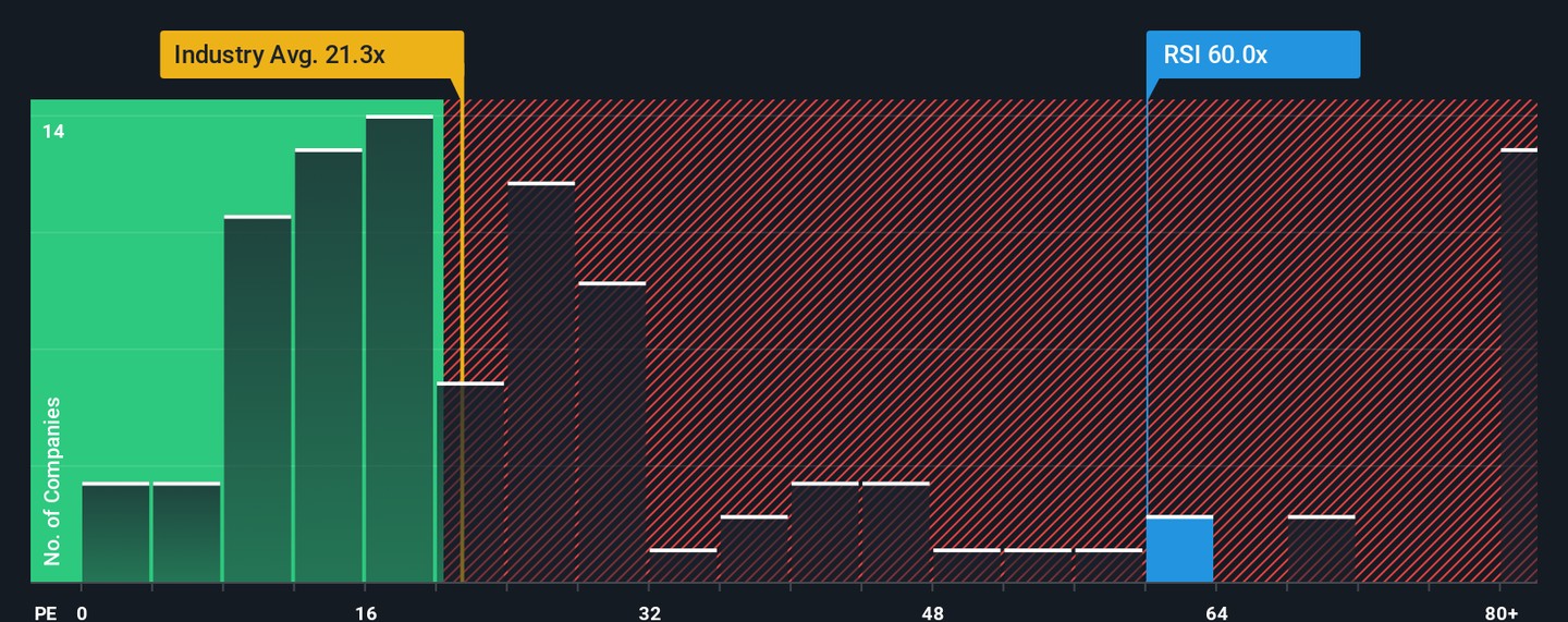 While our earlier fair value projection is optimistic, the current market valuation using the price-to-earnings ratio paints a less flattering picture. RSI trades at 60 times earnings, almost triple the US Hospitality industry's typical 21.4x and well above the fair ratio of 24.9x. This steep gap highlights significant valuation risk, raising the question of whether investors could be overestimating future growth.