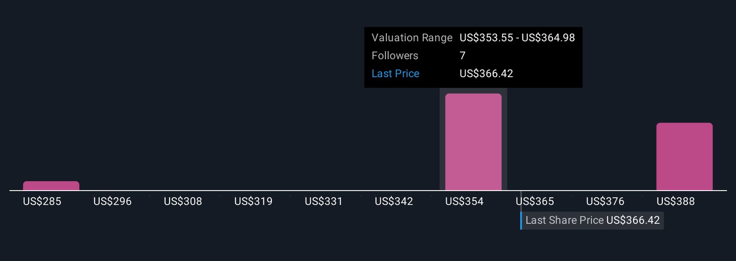 Three fair value estimates from the Simply Wall St Community for Acuity range from US$285 to US$399.25 per share. In light of ongoing tariff and demand uncertainty, these differing views show just how much investor expectations can diverge, consider exploring several perspectives before making a decision.