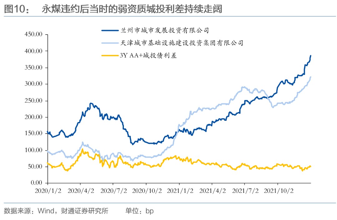 The situation in Lanzhou was similar; in the primary market, Lanzhou's urban investment bond net financing remained negative throughout 2021; in the secondary market, starting from the Yongmei incident in November 2020, the credit spreads of Lanzhou Urban Investment continued to widen.