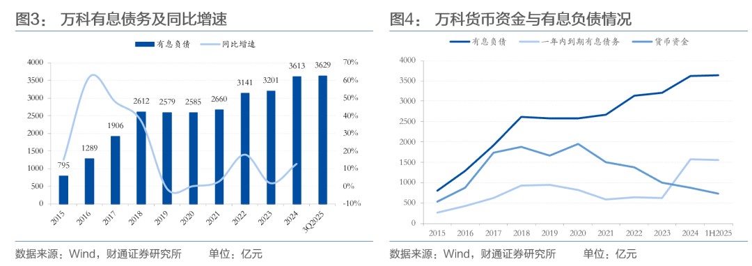 The fundamental reasons are significant debt pressure, poor debt structure, and high short-term repayment pressure. As of the end of September 2025, interest-bearing debt is 362.9 billion yuan, which is already a historical high; in terms of debt structure, according to Vanke's semi-annual report, interest-bearing debt within one year accounts for 42.7%, and the cash-to-short-term debt ratio is only 0.48. If we exclude the restricted portion of monetary funds, the debt pressure would be even greater.