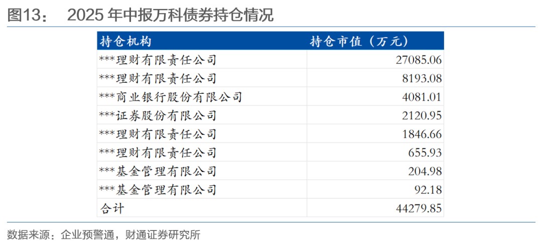 From the perspective of participating investment institutions, the current public institutions holding Vanke bonds should be relatively few. We have compiled the holding data from the 2025 mid-year report and can only observe that two funds hold Vanke's bonds, while others are mainly large-scale financial products and banks with strong volatility resistance.