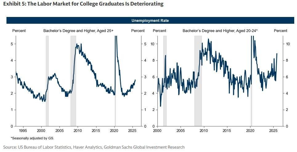 Goldman Sachs Global Investment Research (GIR) data specifically points to a significant deterioration in the employment situation of college-educated workers—currently, the unemployment rate for this group in the 20 to 24 age range has reached 8.5%.