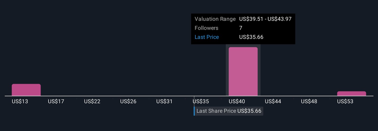 Three members of the Simply Wall St Community provided fair value estimates for Kulicke and Soffa, ranging from US$13.93 to US$57.33. While some see significant upside, others express caution. You’ll encounter contrasting views about risks such as ongoing margin pressure and how these could shape both confidence and caution in sentiment around the stock.