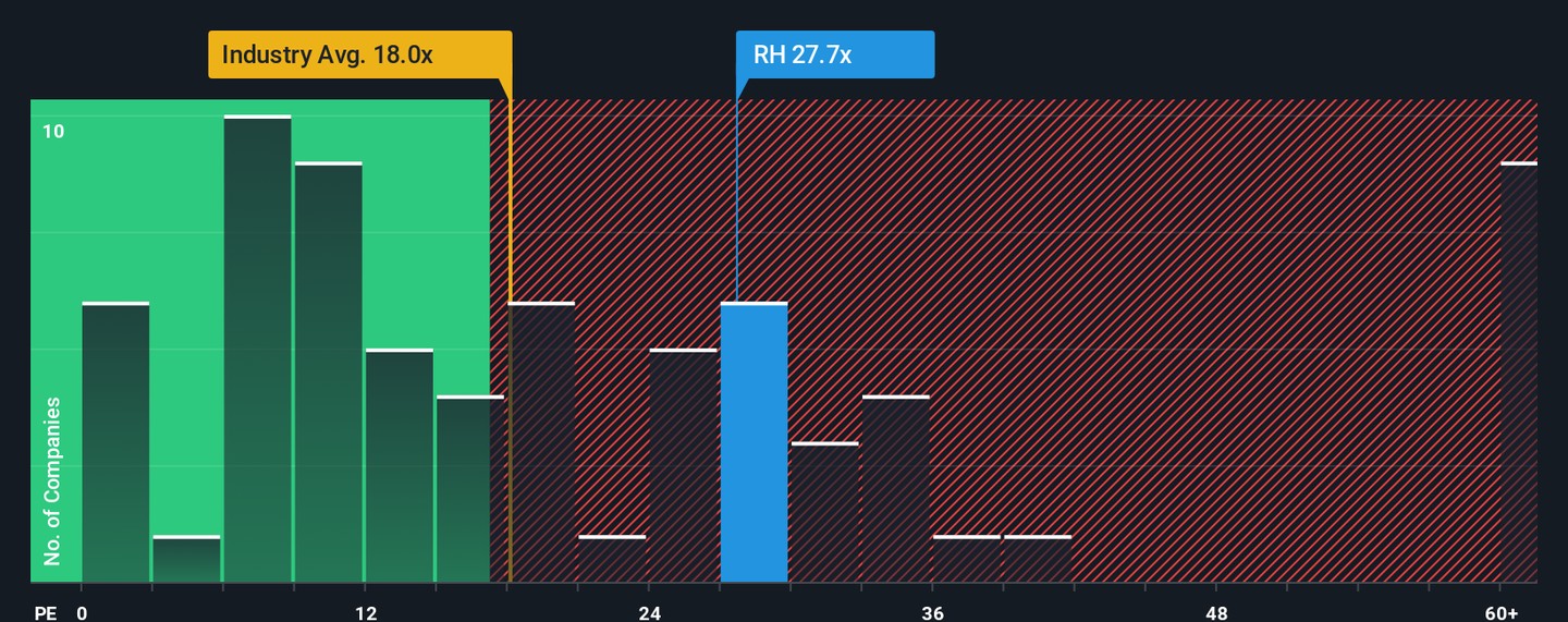 Looking at RH through the lens of earnings multiples, the outlook appears less optimistic. The company's price-to-earnings ratio is 27.7x, which is significantly higher than both the industry average of 18x and the peer average of 18.1x. This indicates the market is paying a substantial premium for RH compared to its competitors, raising questions about how much future growth is already reflected in the stock price. This premium could signal higher risk, or it could reflect market optimism.