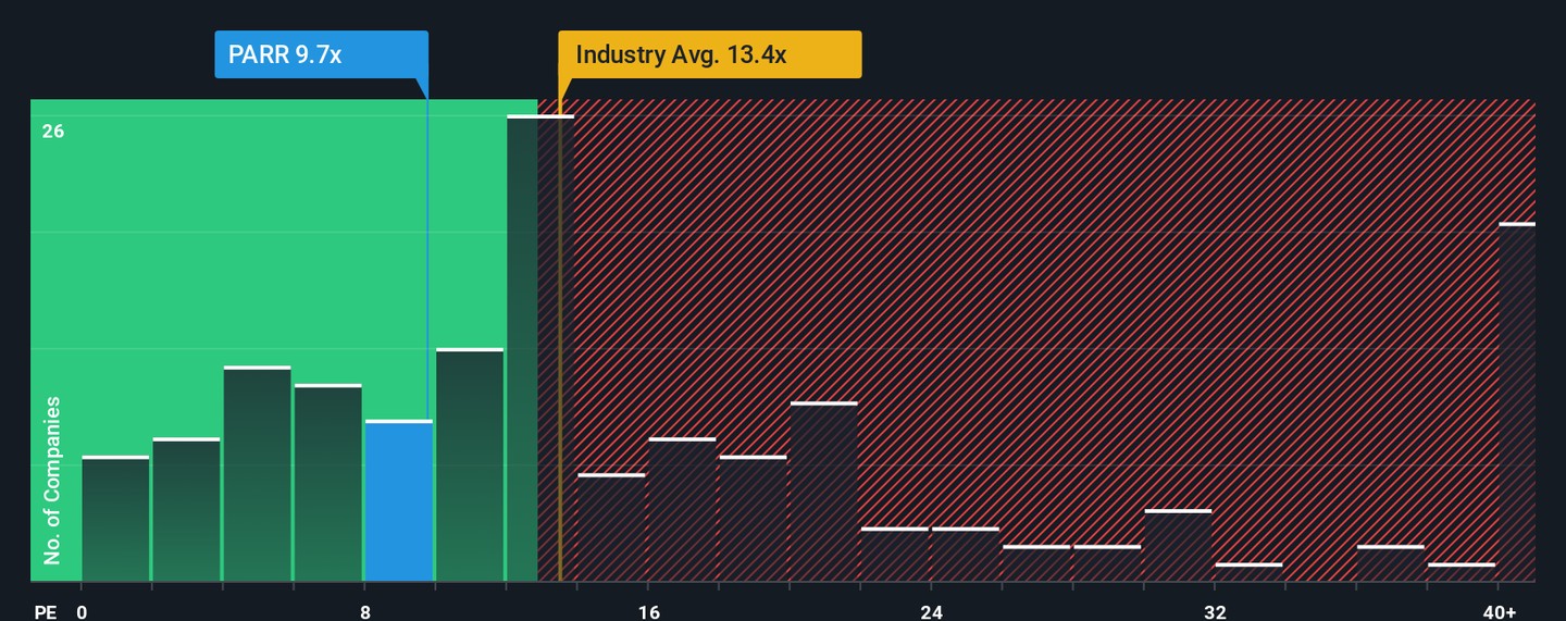 Stepping away from fair value models, let’s consider where Par Pacific stands versus its peers by looking at the price-to-earnings ratio. Par Pacific trades at 9.7x, which is lower than the industry average of 13.4x and the peer average of 23.3x, but slightly higher than its own fair ratio estimate of 8.4x. This may indicate current optimism or additional valuation risk. Could the market be overlooking something, or is this a value trap in disguise?