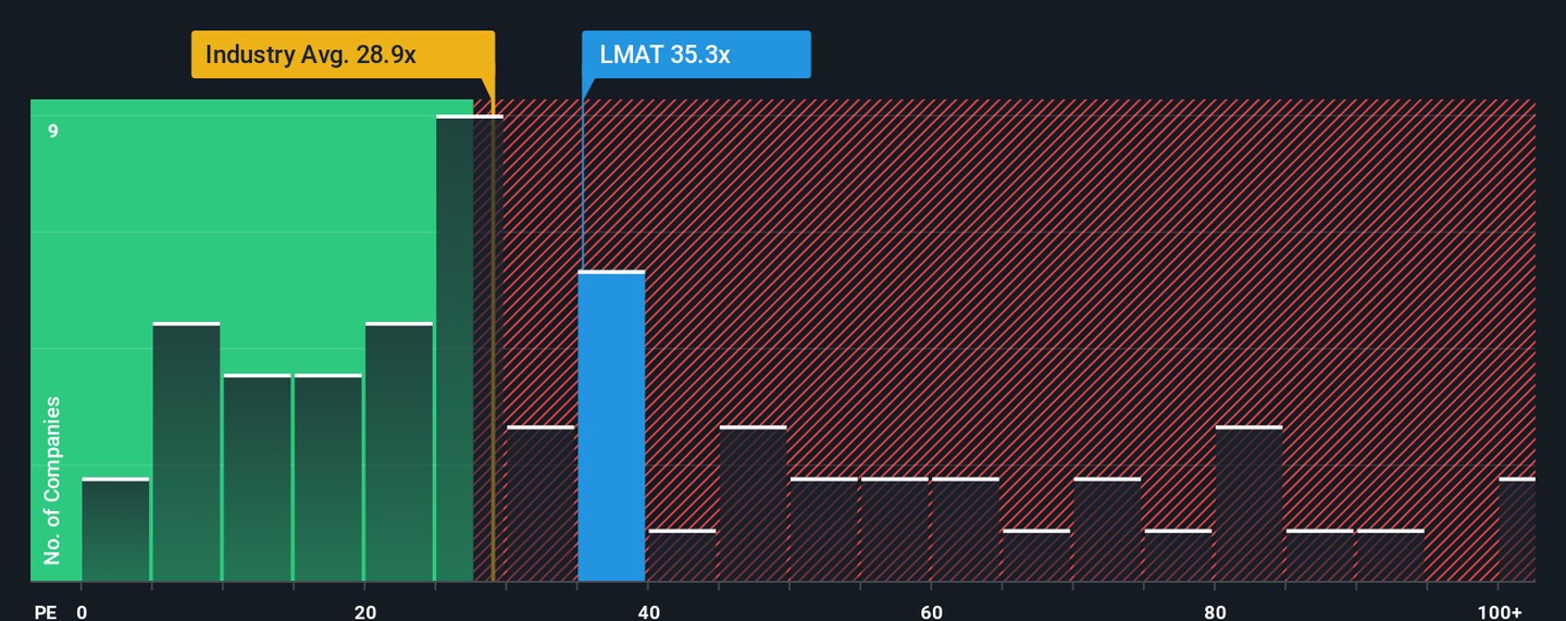 While the fair value narrative points to upside, the latest ratio-based approach signals caution. LeMaitre Vascular is trading at 35.3 times earnings, noticeably higher than both the industry average of 28.9 and its own fair ratio of 17.6. This premium suggests the shares may be priced aggressively compared to peers and historical trends. Is the market layering in too much optimism, or does it know something the numbers do not?