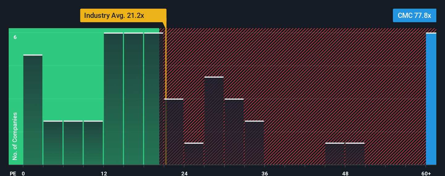Looking at Commercial Metals through the lens of price-to-earnings, the stock appears pricey. Its current ratio stands at 83.6x, noticeably higher than both industry peers (45.1x) and the sector average (22.2x). With a fair ratio estimated at 31.3x, this premium points to a valuation risk that cannot be ignored. Are investors paying too much for future growth, or is something being missed?