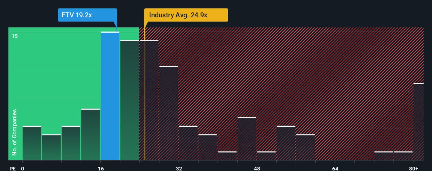 Looking through the lens of the market’s price-to-earnings ratio, Fortive’s stock trades at 19.2 times earnings, which is lower than both the US Machinery industry average at 24.9x and the average of key peers at 25.1x. While this points to relatively good value compared to competitors, the fair ratio estimate is 18.8x, suggesting only a slight margin of safety. As a result, investors face a balancing act between price risk and opportunity if the market realigns with the fair ratio.