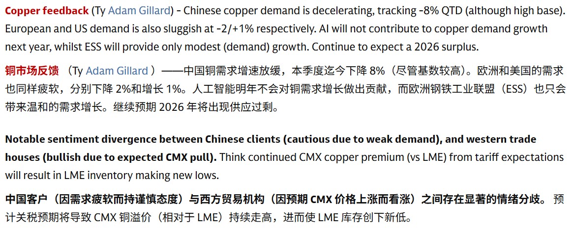 Copper prices hit a new high, but there are differences in views between domestic and foreign investors. There is a significant sentiment divergence between Chinese clients (who are cautious due to weak demand) and Western trading institutions (who are bullish due to expectations of CMX pull). Goldman Sachs expects that the CMX copper premium (continuously rising compared to LME due to tariff expectations) may lead to new lows in LME inventories