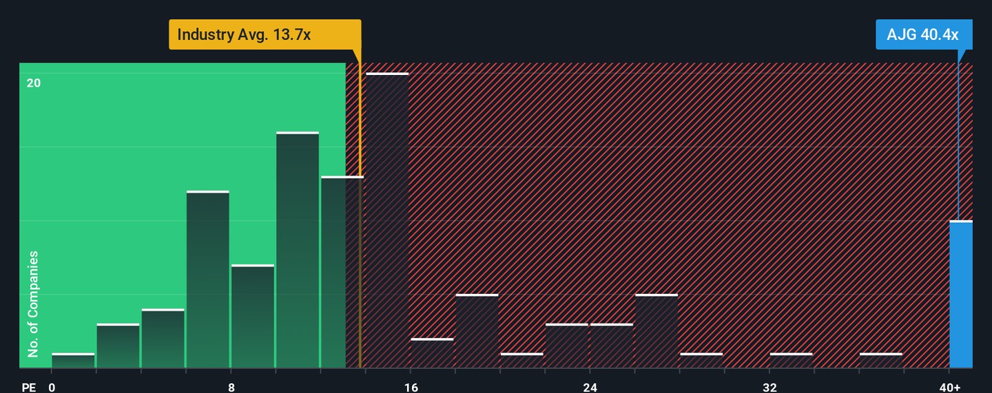 While the fair value calculation suggests AJG could be undervalued, market multiples approach the story quite differently. AJG is trading at nearly 39.7 times earnings, much higher than both its peers’ average of 23x and the US insurance industry average of just 13.2x. The so-called fair ratio stands at 18.2x, less than half AJG’s current level, which signals a potential risk that its valuation could come under pressure if sentiment shifts.