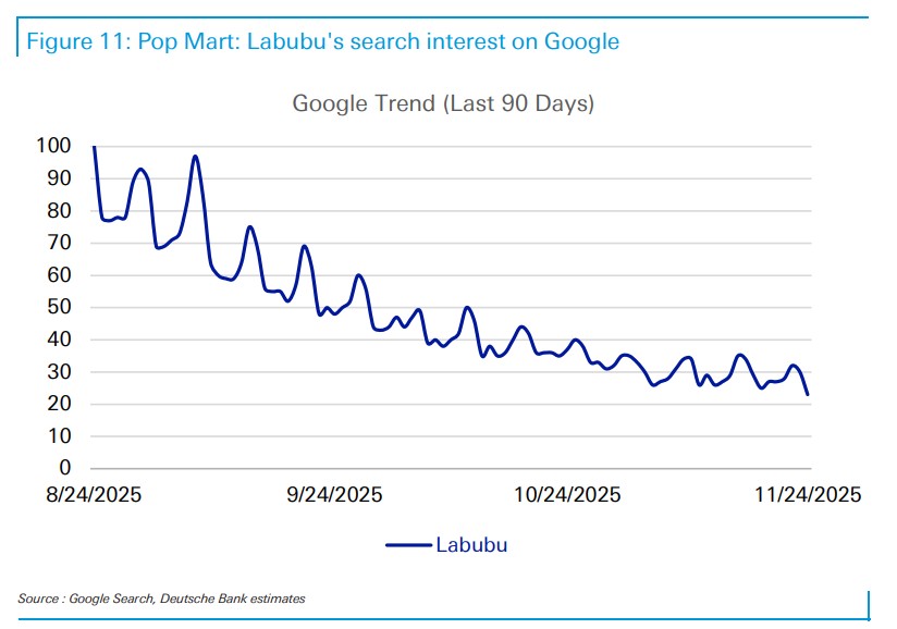 At the same time, the search popularity of Labubu on Google has been declining since mid-2025. This indicates that new user interest is waning while supply continues to flow, and this gap will inevitably lead to a decline in single-store productivity.