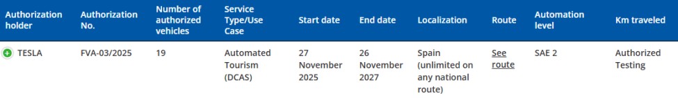 According to the newly published transparency dashboard, Tesla holds authorization FVA-03/2025, covering 19 vehicles that can operate anywhere in Spain, on any national route, for a two-year testing window running until November 2027. This is one of the most expansive autonomous testing approvals in Europe to date.