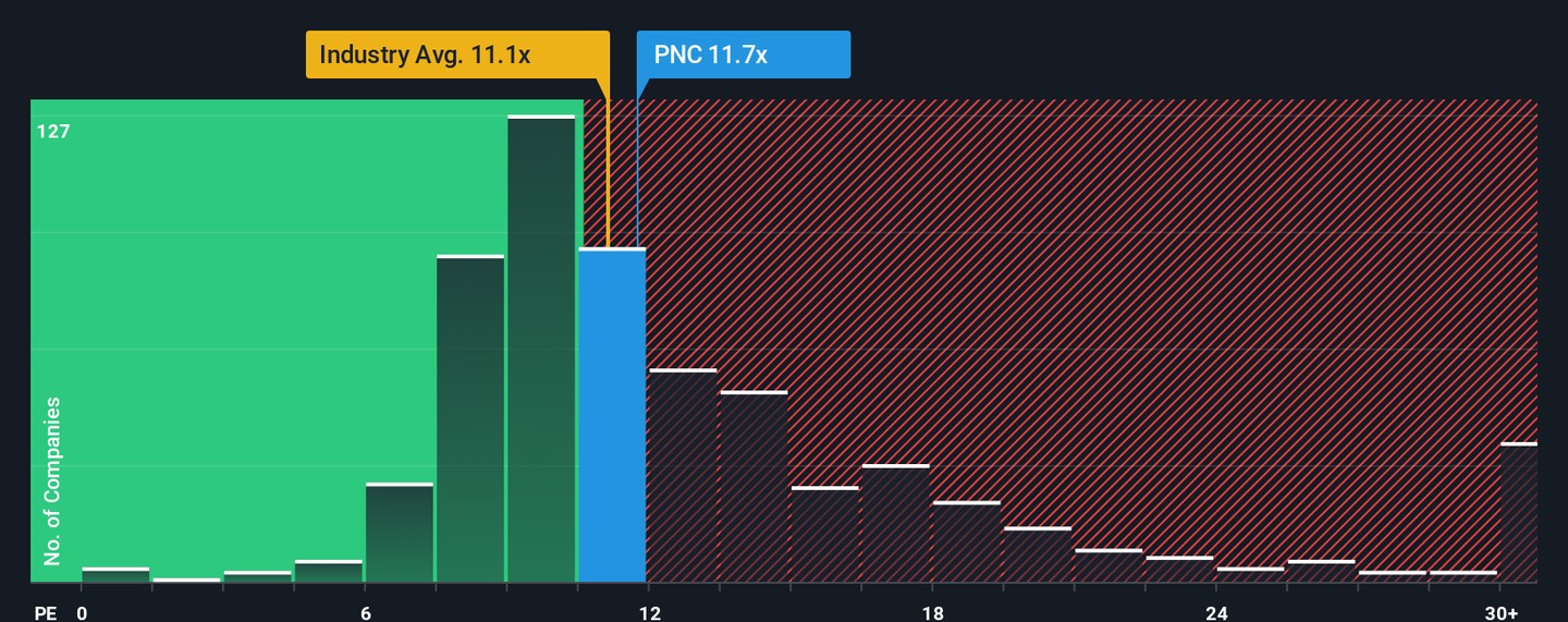 Right now, PNC Financial Services Group trades at a PE ratio of 12.25x. This is slightly higher than the banking industry average of 11.40x, but lower than the peer group average of 17.81x. More importantly, Simply Wall St’s proprietary "Fair Ratio" for PNC is 13.99x. The Fair Ratio goes beyond basic peer and industry comparisons by incorporating the company's expected earnings growth, profit margins, company size, sector trends, and risk profile. This offers a more holistic perspective on what investors should be willing to pay.