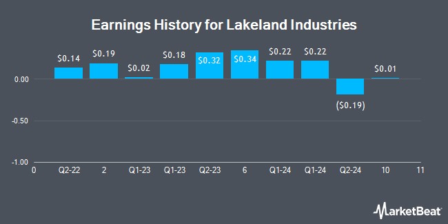 Lakeland Industries (NASDAQ:LAKE - Get Free Report) last announced its quarterly earnings data on Wednesday, September 21st. The medical instruments supplier reported $0.36 earnings per share (EPS) for the quarter. The company had revenue of $27.47 million for the quarter. Lakeland Industries had a negative net margin of 11.22% and a negative return on equity of 3.07%. On average, analysts expect Lakeland Industries to post $0 EPS for the current fiscal year and $2 EPS for the next fiscal year.