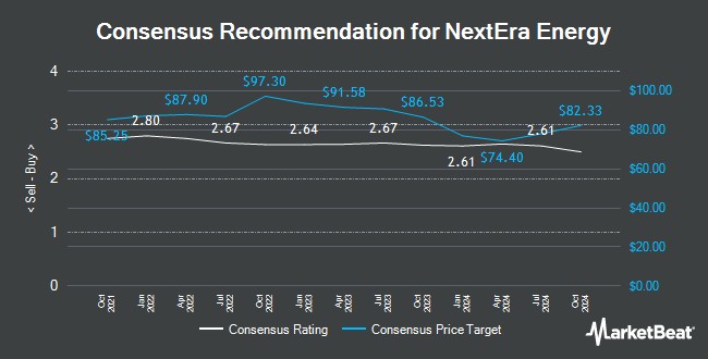 Several other analysts have also commented on NEE. JPMorgan Chase & Co. increased their price target on shares of NextEra Energy from $86.00 to $87.00 and gave the company an "overweight" rating in a research report on Friday, August 22nd. Evercore ISI reissued an "outperform" rating and set a $93.00 target price on shares of NextEra Energy in a research report on Tuesday, October 28th. UBS Group restated a "buy" rating and issued a $96.00 target price (up from $84.00) on shares of NextEra Energy in a research note on Wednesday, October 29th. Jefferies Financial Group reaffirmed a "hold" rating and issued a $85.00 price target (up from $77.00) on shares of NextEra Energy in a report on Tuesday, October 14th. Finally, New Street Research set a $84.00 price target on NextEra Energy in a research report on Monday, October 13th. Three investment analysts have rated the stock with a Strong Buy rating, thirteen have issued a Buy rating and five have given a Hold rating to the company. Based on data from MarketBeat.com, the company presently has an average rating of "Moderate Buy" and an average target price of $91.00.