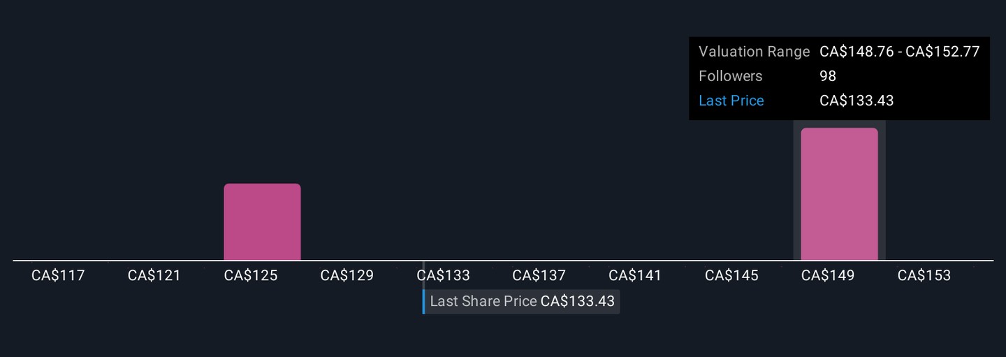 For example, one investor may model a bullish scenario where Canadian National Railway rides the North American "reshoring" trend to a fair value of CA$284.80, while another sees modest growth and assigns a fair value as low as CA$133.00. With Narratives, you can put your own view front and center, quickly spot differences in outlook among investors, and respond confidently as fresh data comes in.