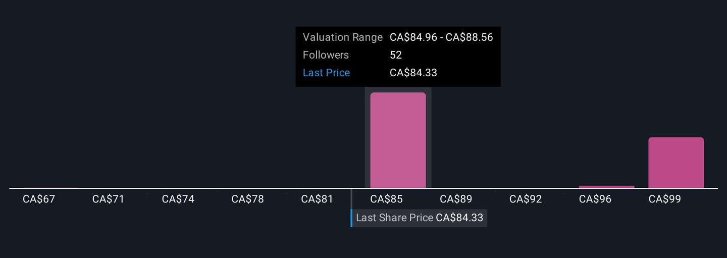 This empowers better buy or sell decisions because you can instantly compare the fair value from your Narrative to the current share price. For example, for Nutrien, some investors forecast robust earnings growth and assign a bullish value close to CA$96.39 per share, while others take a cautious view, expecting headwinds, and use a far lower estimate of CA$61.11. Narratives make these perspectives explicit and actionable, so you can invest smarter with your outlook leading the way.