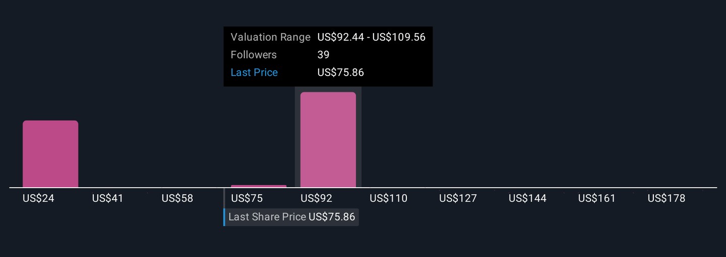 Earlier we mentioned that there is an even better way to understand valuation, so let us introduce you to Narratives, which are simply the stories investors tell about a company that connect what they believe about its products, competition and execution to specific forecasts for future revenue, earnings and margins, and ultimately to a Fair Value they can compare with today’s price. On Simply Wall St’s Community page, millions of investors use Narratives as an easy, guided tool to turn their view of a business into a full financial model, then quickly see whether their Fair Value says the stock is a buy, a hold, or a sell at the current market price, and those Narratives are continually updated as new information like earnings, guidance or major news is released. With Affirm, for example, a more optimistic Narrative might assume revenue grows around the mid 20 percent range annually, margins expand toward the mid teens and a future PE in the low 40s is justified, supporting a Fair Value near $93, while a more cautious Narrative could build in slower top line growth, thinner margins and a lower exit multiple, leading to a Fair Value closer to $64 and a very different buy or sell conclusion.