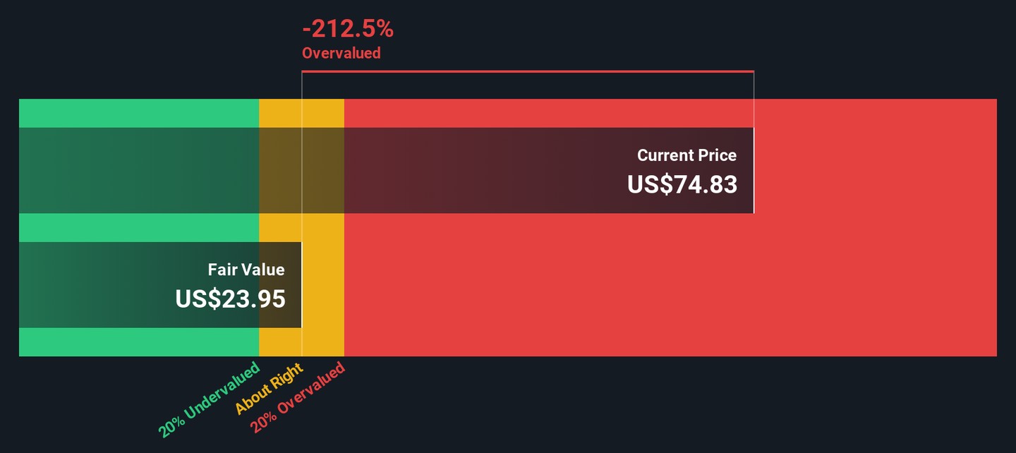 Rolling these assumptions forward, the Excess Returns valuation implies an intrinsic value of about $31.68 per share. Compared with the current market price, this indicates the stock is roughly 111.5% overvalued. In this framework, the market price stands well above the level suggested by these modeled returns.