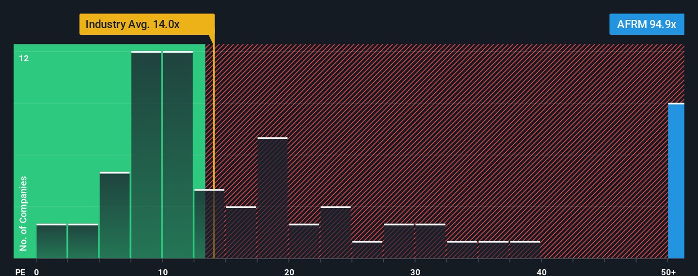 In practice, faster growing and less risky companies tend to justify higher PE multiples, while slower or more volatile businesses usually warrant lower ones. Affirm currently trades on a PE of about 94.9x, which is far richer than both the Diversified Financial industry average of around 14x and the broader peer group average near 28.3x. That headline comparison suggests the market is pricing in very strong growth and accepting a lot of execution risk.