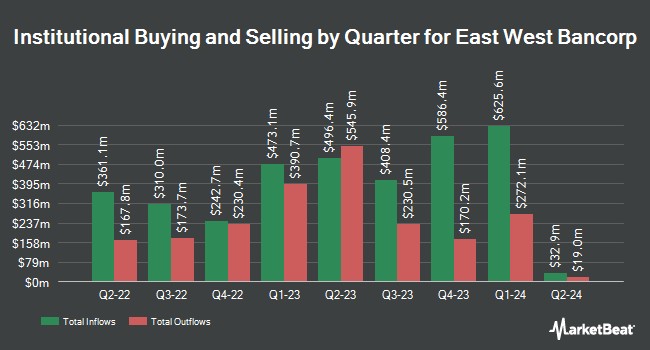 A number of other institutional investors and hedge funds have also made changes to their positions in the stock. US Bancorp DE grew its position in East West Bancorp by 880.7% during the second quarter. US Bancorp DE now owns 21,625 shares of the financial services provider's stock worth $2,184,000 after buying an additional 19,420 shares during the period. Deutsche Bank AG lifted its position in shares of East West Bancorp by 16.5% during the 1st quarter. Deutsche Bank AG now owns 21,516 shares of the financial services provider's stock valued at $1,931,000 after acquiring an additional 3,052 shares during the period. Invesco Ltd. boosted its stake in shares of East West Bancorp by 155.6% during the 1st quarter. Invesco Ltd. now owns 7,714,661 shares of the financial services provider's stock worth $692,468,000 after acquiring an additional 4,696,157 shares in the last quarter. Inspire Investing LLC purchased a new stake in shares of East West Bancorp during the 1st quarter worth approximately $2,187,000. Finally, Charles Schwab Investment Management Inc. grew its holdings in shares of East West Bancorp by 7.1% in the 1st quarter. Charles Schwab Investment Management Inc. now owns 4,733,102 shares of the financial services provider's stock worth $424,843,000 after acquiring an additional 314,262 shares during the period. 89.53% of the stock is owned by institutional investors and hedge funds.