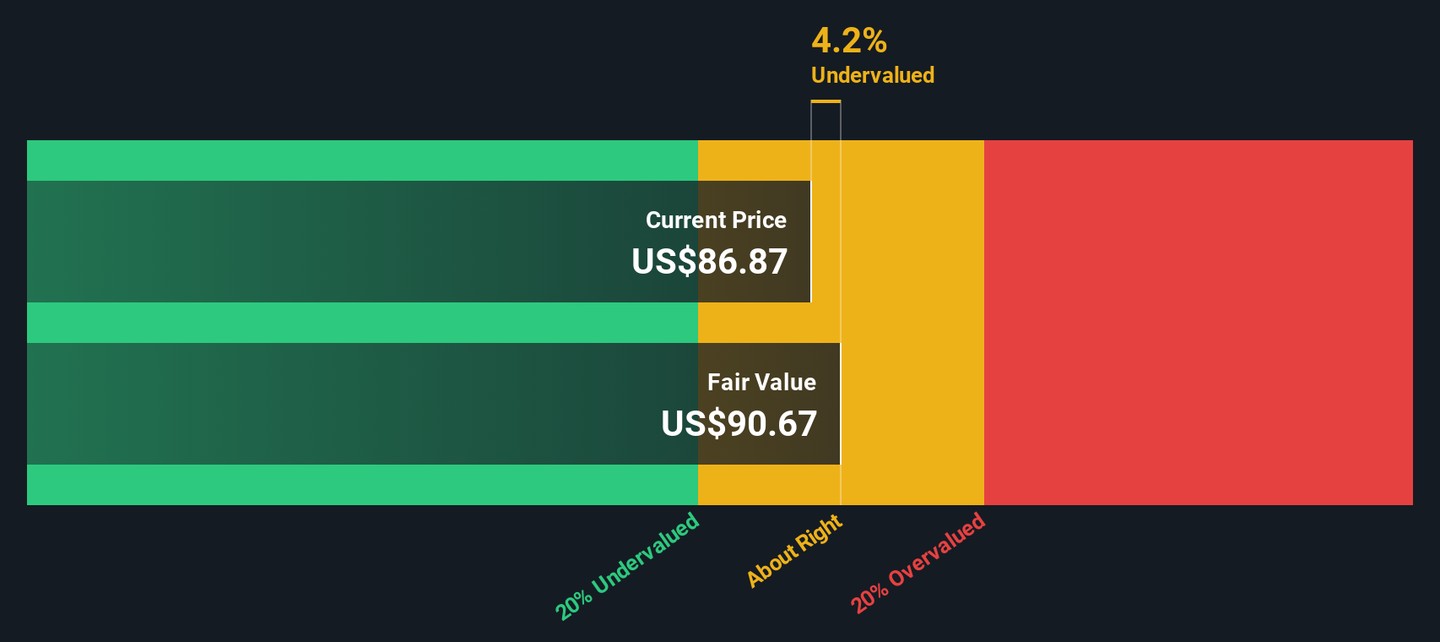 When these projected cash flows are discounted back to today, the model arrives at an intrinsic value of about $148 per share. Compared with the current share price, this implies the stock trades at roughly a 29.0% discount, indicating the market price may not fully reflect the assumed growth path in the model.