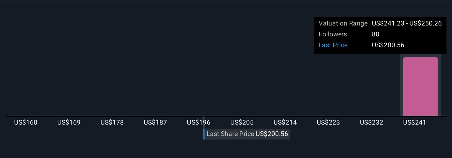 Eight members of the Simply Wall St Community currently place Danaher’s fair value between US$174.19 and US$254.20, reflecting a wide spread of expectations. When you set these views against the company’s premium earnings multiple and its reliance on bioprocessing and genomics end markets, it underlines why examining several risk and growth scenarios can matter for long term outcomes.