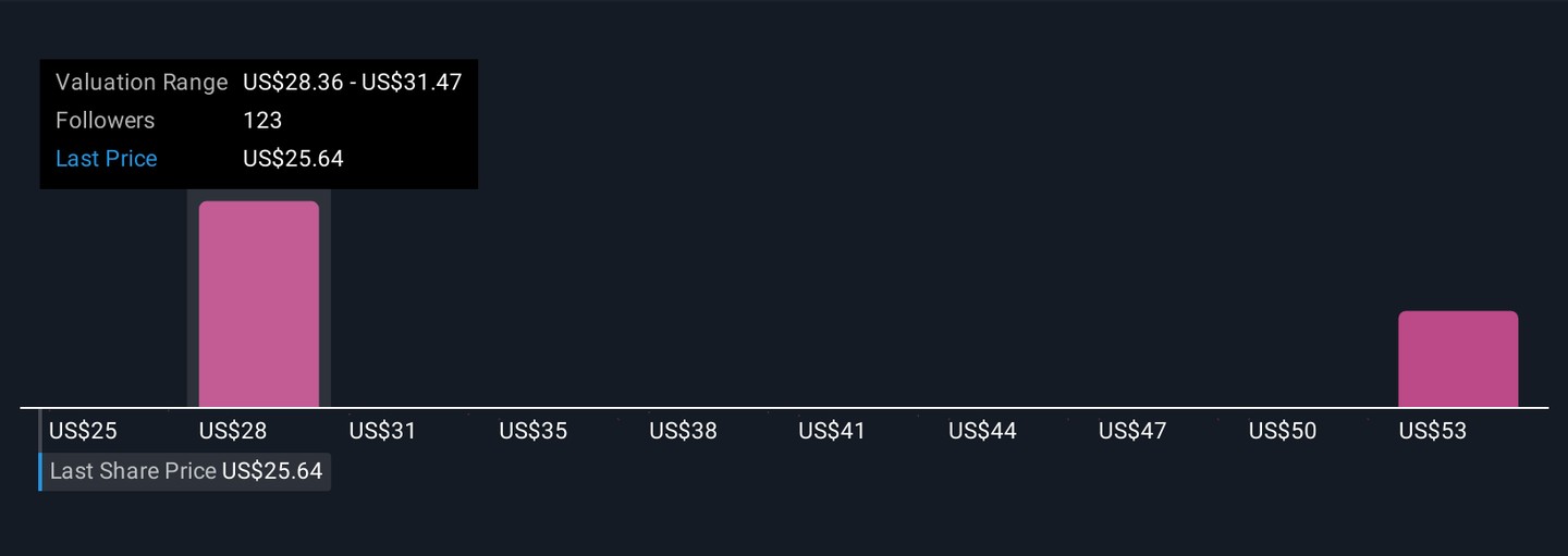 Earlier we mentioned that there is an even better way to understand valuation, so let us introduce you to Narratives, a simple way to connect your view of Columbia Banking System’s business to a set of numbers, from future revenue, earnings and margins through to a personal fair value estimate, all within the Community page on Simply Wall St that millions of investors use. A Narrative is your story behind the numbers, linking what you believe about Columbia’s strategy, competitive position and risks to a forward looking forecast and, ultimately, a fair value that you can compare to today’s share price to decide whether it looks like a buy, a hold, or a sell. Because Narratives on the platform update dynamically when new earnings, news or guidance is released, they stay alive and relevant instead of being a one off spreadsheet. For Columbia right now, one investor’s Narrative might lean toward the higher end of recent analyst targets, expecting benefits from digital investments and expansion to justify a fair value closer to $35, while another, more cautious Narrative could anchor around $25, emphasizing integration risks and funding pressures.
