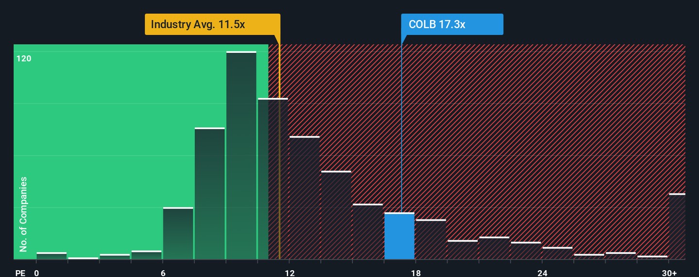 In general, higher expected growth and lower perceived risk justify a higher, or more generous, PE multiple, while slower growth or elevated risk usually mean a lower, more cautious multiple. Columbia currently trades on a PE of about 17.3x, above the wider Banks industry average of around 11.5x, but below the roughly 30.0x average of its peer group, which includes some faster growing or more richly valued names.