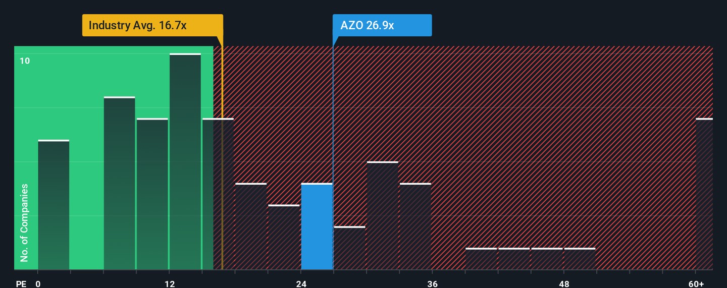 AutoZone currently trades at about 25.5x earnings. That is above the broader Specialty Retail industry average of roughly 17.9x, but still below the peer group average of around 35.6x. To refine this comparison, Simply Wall St uses a proprietary Fair Ratio, which estimates what a reasonable PE should be after factoring in the company’s earnings growth, industry positioning, profit margins, market cap and specific risks.