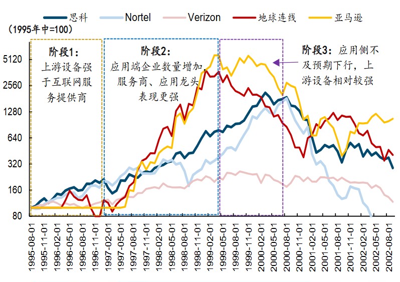 The technology stock market from 1995 to 2000 can be roughly divided into three periods: (1) 95-97, upstream equipment companies saw significant revenue growth, while downstream internet business models were immature; (2) 97-98, capital expenditure by midstream service providers increased significantly, and downstream internet companies emerged on a large scale; (3) 99-00, downstream revenue grew rapidly but cash flow conditions continued to deteriorate.