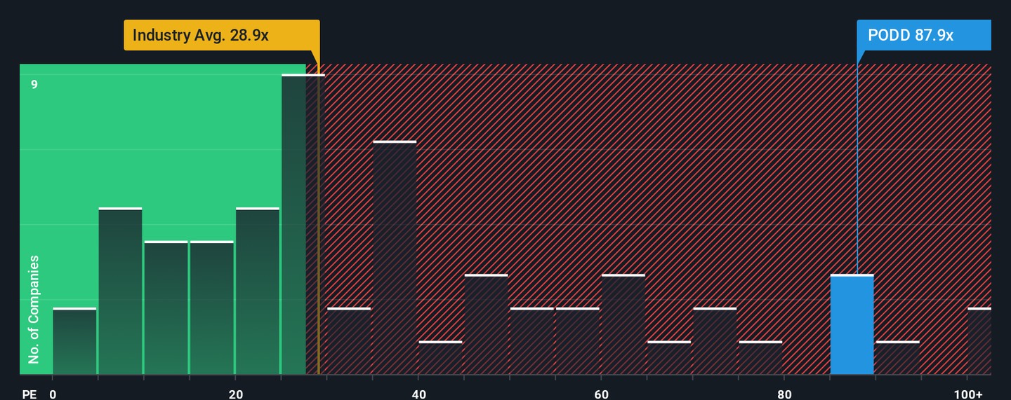 While the narrative fair value suggests upside, the market is already paying a steep price. Insulet trades on a price to earnings ratio of 87.9 times, versus about 30 times for peers and 37.6 times as a fair ratio. This means any stumble could trigger a sharp de rating.