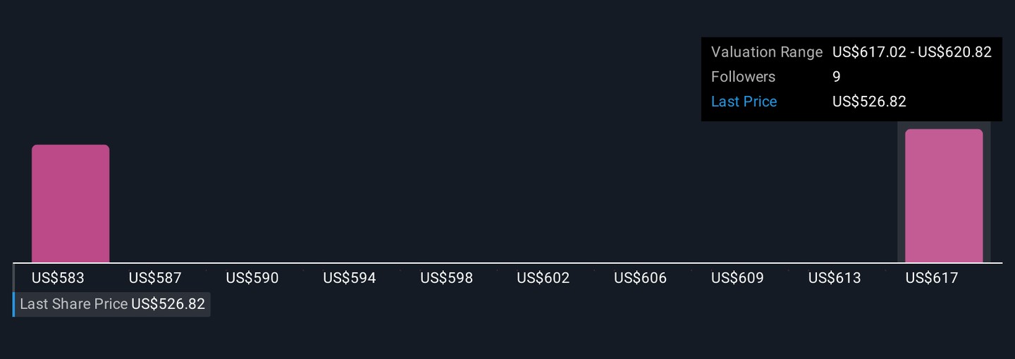Two fair value estimates from the Simply Wall St Community cluster between about US$583 and US$621 per share, underscoring how differently individual investors can view Teledyne’s potential. Against that backdrop, the recent push into higher throughput imaging with Xtium3 reinforces the importance of understanding both the upside from advanced sensing demand and the ongoing risk that margins in acquired and legacy imaging businesses remain under pressure, so you can weigh several competing narratives about the company’s future performance.